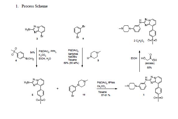 CEP-33779 is a triazole that has been reported to show highly selective inhibition of Janus kinase 2 (JAK2). An efficient process to form CEP-33779 will be presented that uses multiple palladium couplings to provide the drug substance in a convergent manner. The existing medicinal chemistry route was modified to avoid chromatographic purification, improve safety, and utilize palladium ligands which are available in quantities amenable to scale-up. Challenges faced during the development of the new process included optimization of conditions for Buchwald–Hartwig and Suzuki couplings, control of homocoupled impurities and removal of residual palladium. In addition, a screen of conditions to form a diglycolate salt of the parent compound are also presented.
