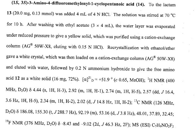 (1S, 3S)3-Amino-4-difluoromethylenyl-1-cyclopentanoic acid (15). To lactam 14 (20.0 mg, 0.13 mmol) was added 4 mL of 4 N HCl. The solution was stirred at 70° C. for 10 h. After being washed with ethyl acetate (3×4 mL), the water layer was evaporated under reduced pressure to give a yellow solid. Recrystallization with ethanol/ether gave a white solid, which was then loaded on a cation-exchange column (AG50W-X8) and eluted with 0.2 N ammonium hydroxide to give the free amino acid 15 as a white solid (16 mg, 72%). 1H NMR (400 MHz, D2O) δ 4.44 (s, 1H), 2.92 (m, 1H), 2.74 (m, 1H), 2.57 (dd, J 16.4, 3.6 Hz, 1H), 2.34 (m 1H), 2.02 (d, J 14.8 Hz, 1H); 13C NMR (126 MHz, D2O) δ 186.08, 155.30 (t, J 288.7 Hz), 92.19 (m), 53.16 (d, J 3.8 Hz), 48.01, 37.89, 32.45; 19F NMR (376 MHz, D2O) δ −8.43 and −9.02 (2d, J 46.3 Hz, 2F); MS (ESI) C7H9NO2F2 calcd M+H 178, found M+H 178.