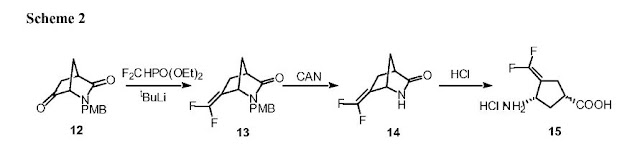 [0067] (IS, 4S)-6-Difluoromethylenyl-2-(4′-methoxybenzyl)-2- azabicyclo[2.2.1]heptan-3-one (13). At -78 °C, T uLi (1.7 M in pentane, 1.73 mL, 2.94 mmol) was slowly added to a stirred solution of diethyl (difluoromethyl)phosphonate (0.48 mL, 2.94 mmol) in anhydrous THF (15 mL). After being stirred for 0.5 h at -78 °C, 12 (0.60g, 2.45 mmol) in anhydrous THF (20 mL) was slowly added via syringe. Stirring continued for 1 h at – 78 °C , then the solution was allowed to warm to room temperature and heated to reflux for 24 h. Compound 12 is known and available in the art, and can be prepared as described in Qiu, J.; Silverman, R.B. A New Class of Conformationally Rigid Analogues of 4-Amino-5- halopentanoic Acids, Potent Inactivators of γ-Aminobutyric Acid Aminotransferase. J. Med. Chem. 2000, 43, 706-720. After the reaction had cooled down, THF was evaporated, and saturated NH4C1 solution (20 mL) was added to the residue, which was extracted with EtOAc (3 x 20 mL). The organic layer was washed with brine (2 x 20 mL), dried over anhydrous Na2S04, and concentrated under reduced pressure. The residue was purified by flash column
