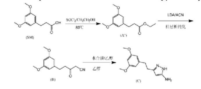 (3) In addition, patent application WO2016137506A1 discloses a method for preparing AZD4547 key intermediate 3-(3,5-dimethoxyphenethyl)-1H-pyrazole-5-amine, as follows: