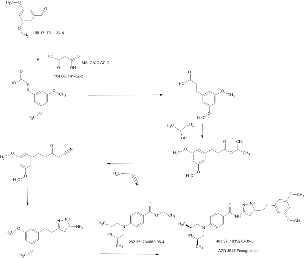 In this preparation method, 3-(3,5-dimethoxyphenyl)propionic acid is used as the starting material, and AZD4547 is prepared through a five-step reaction with a total yield of 42.5%. In this preparation method, highly toxic reagent ethyl cyanoacetate and expensive reagents palladium carbon, stannous chloride, and Raney nickel are required, and it is not suitable for industrial production.