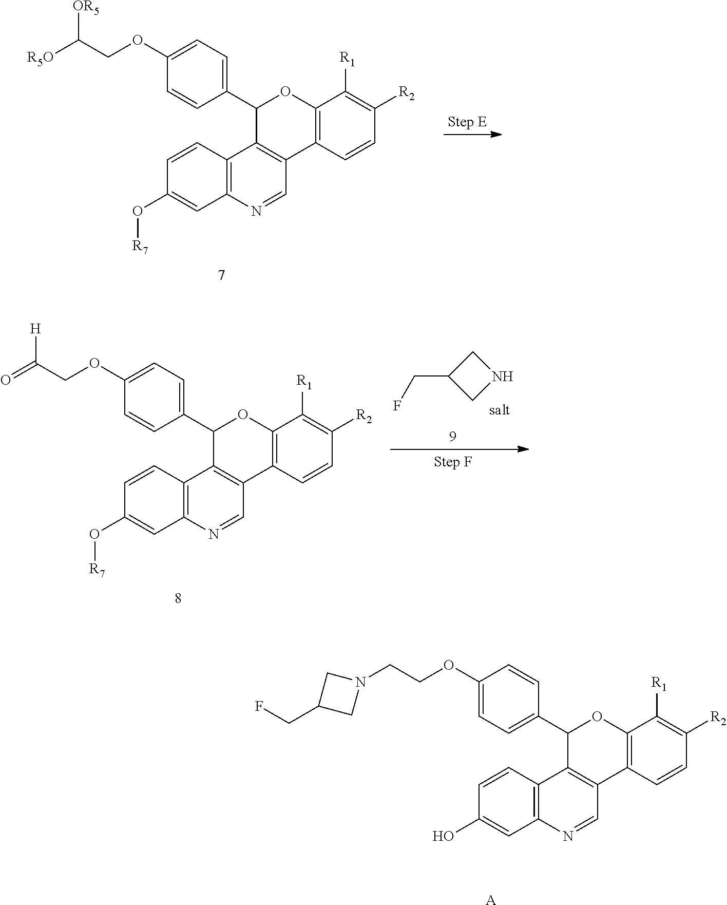 5-(4-{2-[3-(Fluoromethyl)azetidin-1-yl]ethoxy}phenyl)-8-(trifluoromethyl)-5H-[1]benzopyrano[4,3-c]quinolin-2-ol, Isomer 1Separate the two enantiomers of 5-(4-{2-[3-(fluoromethyl)azetidin-1-yl]ethoxy}phenyl)-8-(trifluoromethyl)-5H-[1]benzopyrano[4,3-c]quinolin-2-ol by chiral SFC with the following conditions: Column: LUX® Cellulose-1, 5×25 cm; eluting with a mobile phase of 30% iPrOH (with 0.5% DMEA) in CO 2; column temperature: 40° C.; flow rate: 300 g/minute; UV detection wavelength: 270 nm to give Example 1A as the first eluting enantiomer (Isomer 1). ES/MS (m/z): 525.2 (M+H). Confirm enantiomeric enrichment of Isomer 1 by chiral analytical SFC, >99% ee, t (R): 1.30 minutes; column: CHIRALCEL® OD-H, 4.6×150 mm; eluting with a mobile phase of 30% MeOH (0.2% IPA) in CO 2; column temperature: 40° C.; flow rate: 5 mL/minute; UV detection wavelength: 225 nm. Isolate the title compound of Example 1B to give the second eluting enantiomer (Isomer 2). ES/MS (m/z): 525.2 (M+H). Confirm enantiomeric enrichment of Isomer 2 by chiral analytical SFC, 98% ee, t (R): 2.03 minutes; column: CHIRALCEL® OD-H, 4.6×150 mm; eluting with a mobile phase of 30% MeOH (0.2% IPA) in CO 2; column temperature: 40° C.; flow rate: 5 mL/minute; UV detection wavelength: 225 nm.