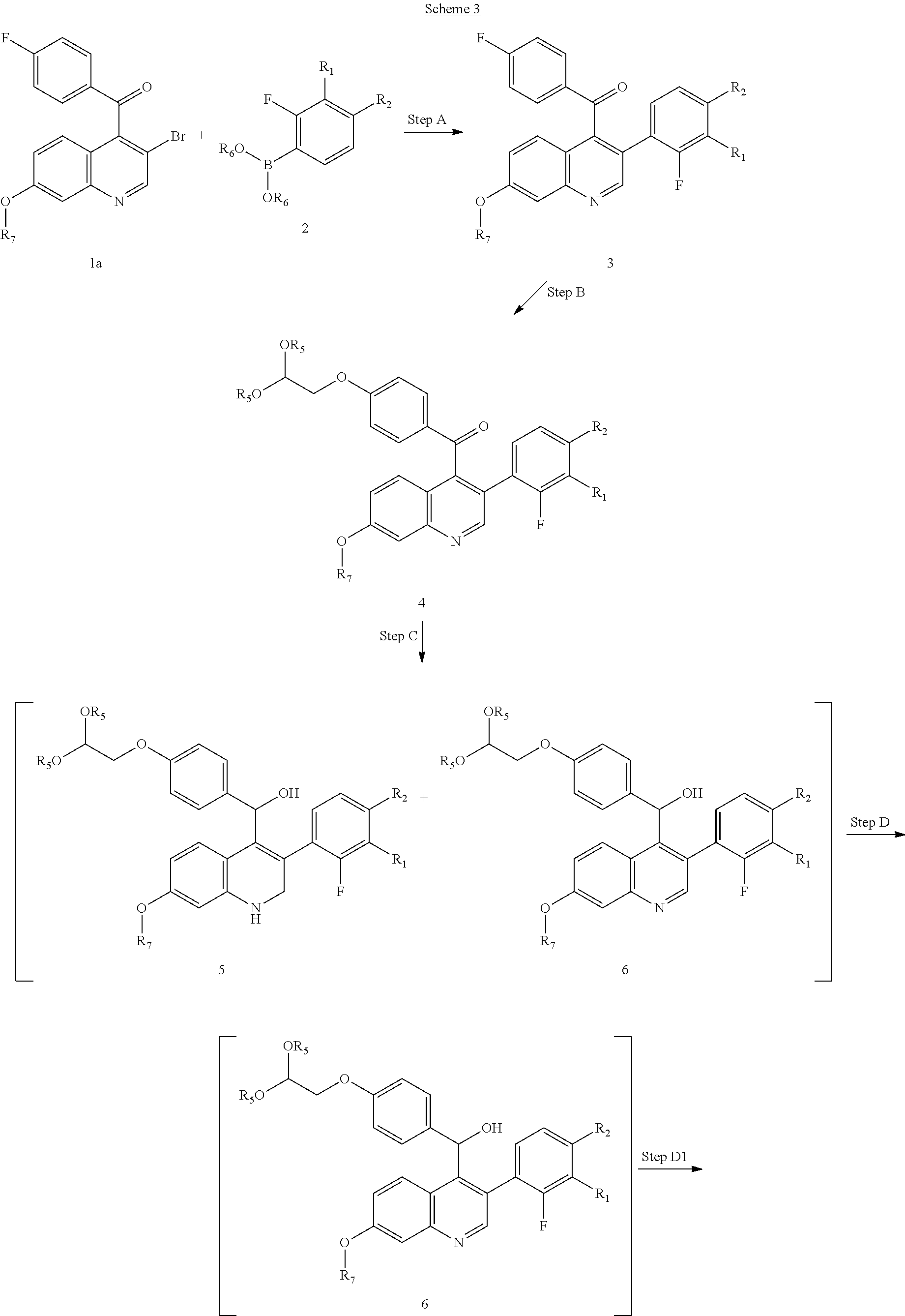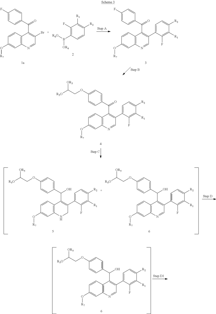 Cool a solution of (4-{2-[3-(fluoromethyl)azetidin-l-yl]ethoxy}phenyl){3-[2-fluoro-4-(trifluoromethyl)phenyl]-7-hydroxyquinolin-4-yl}methanone (5.27 g, 9.71 mmol) in 1,4-dioxane (100 mL) to 5 °C. Add lithium triethylborohydride (1 M in THF, 30.0 mL, 30.0 mmol). Remove the cooling bath and stir for 1.5 hours at room temperature. Quench the mixture with water. Add saturated NH4Cl solution and EtOAc. Separate the layers and extract the aqueous layer with EtOAc. Combine the organic extracts, dry over anhydrous MgS04, filter, and concentrate the filtrate. Dissolve the crude residue in THF (100 mL).