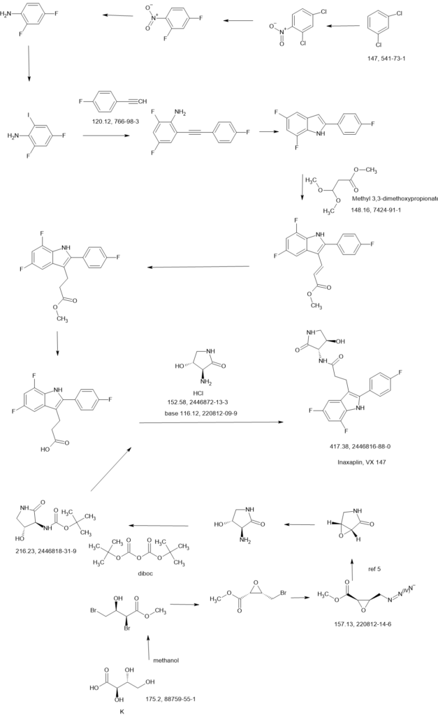 Synthesis of 3-[5,7-difluoro-2-(4-fluorophenyl)-1H-indol-3-yl]-N-[(3S,4R)-4-hydroxy-2-oxo-pyrrolidin-3-yl]propanamide (2)