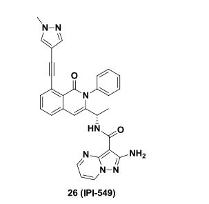 Optimization of isoquinolinone PI3K inhibitors led to the discovery of a potent inhibitor of PI3K-γ (26 or IPI-549) with >100-fold selectivity over other lipid and protein kinases. IPI-549 demonstrates favorable pharmacokinetic properties and robust inhibition of PI3K-γ mediated neutrophil migration in vivo and is currently in Phase 1 clinical evaluation in subjects with advanced solid tumors.