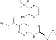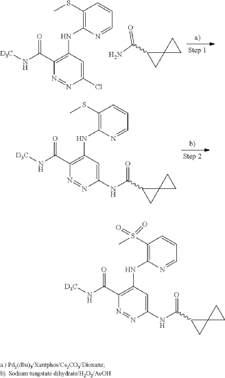 To a suspension of hydrogen peroxide (30% solution in water, 0.258 mL, 2.52 mmol) and (R)—N-(methyl-d3)-4-((3-(methylthio)pyridin-2-yl)amino)-6-(spiro[2.2]pentane-1-carboxamido)pyridazine-3-carboxamide (0.0489 g, 0.126 mmol) in AcOH (1 mL) was added sodium tungstate dihydrate (0.042 g, 0.126 mmol) at room temperature. After stirring at room temperature for 1 hour, the reaction was diluted with water, basified with Na 2CO 3 powder and extracted three times with DCM. The DCM layers were combined, washed with Na 2S 2O 3 (5% solution), dried (Na 2SO 4), filtered and concentrated. The crude product was purified using reverse phase prepHPLC to give the title compound (R)—N-(methyl-d3)-4-((3-(methylsulfonyl)pyridin-2-yl)amino)-6-(spiro[2.2]pentane-1-carboxamido)pyridazine-3-carboxamide (16.2 mg, 31%) as a colorless solid. 1H NMR (500 MHz, DMSO-d 6) δ 12.07 (s, 1H), 11.22 (s, 1H), 9.49 (s, 1H), 9.16 (s, 1H), 8.63 (dd, J=4.6, 1.5 Hz, 1H), 8.29 (dd, 0.1=7.8, 1.4 Hz, 1H), 7.34 (dd, 0.1=7.8, 4.7 Hz, 1H), 2.48-2.43 (m, 1H), 1.46-1.41 (m, 1H), 1.42-1.36 (m, 1H), 0.95-0.82 (m, 3H), 0.80-0.73 (m, 1H). (3H methyl sulfone was buried under DMSO peak). LCMS (ESI) m/e 420.0 [(M+H) +, calc’d C 18H 18D 3N 6O 4S, 420.1]; LC/MS retention time (method E): t R=1.38 min; OR: −205.39 (20° C.).