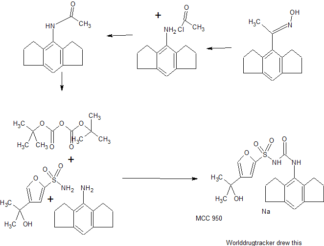 A novel synthesis of the anti-inflammatory agent 1-(1,2,3,5,6,7- hexahydro-s-indacen-4-yl)-3-[4-(1-hydroxy-1-methyl-ethyl)-furan-2-sulfonyl] urea 1 is described. Sulfonamide 5 was prepared starting from ethyl 3-furoate 2. Key steps were a one-pot sulfonylation with chlorosulfonic acid in methylene chloride followed by pyridinium salt formation and reaction with phosphorus pentachloride to provide ethyl 2-(chlorosulfonyl)-4-furoate 7. This sulfonyl chloride was treated with ammonium bicarbonate to form sulfonamide 8, followed by treatment with excess methyl magnesium chloride to provide 4-(1-hydroxy-1-methyl-ethyl)-furan-2-sulfonamide 5. 4-Isocyanato-1,2,3,5,6,7-hexahydro-s-indacene 16 was prepared from indan in five steps. The formation of the desired sulfonyl urea was carried out both with the isolated isocyanate 16 and via an in situ method.