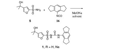 A novel synthesis of the anti-inflammatory agent 1-(1,2,3,5,6,7- hexahydro-s-indacen-4-yl)-3-[4-(1-hydroxy-1-methyl-ethyl)-furan-2-sulfonyl] urea 1 is described. Sulfonamide 5 was prepared starting from ethyl 3-furoate 2. Key steps were a one-pot sulfonylation with chlorosulfonic acid in methylene chloride followed by pyridinium salt formation and reaction with phosphorus pentachloride to provide ethyl 2-(chlorosulfonyl)-4-furoate 7. This sulfonyl chloride was treated with ammonium bicarbonate to form sulfonamide 8, followed by treatment with excess methyl magnesium chloride to provide 4-(1-hydroxy-1-methyl-ethyl)-furan-2-sulfonamide 5. 4-Isocyanato-1,2,3,5,6,7-hexahydro-s-indacene 16 was prepared from indan in five steps. The formation of the desired sulfonyl urea was carried out both with the isolated isocyanate 16 and via an in situ method.