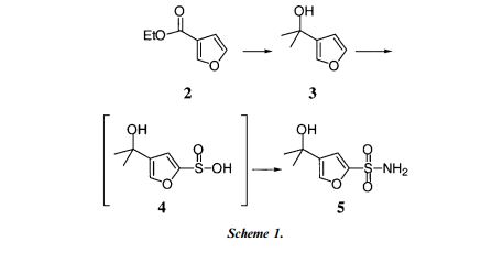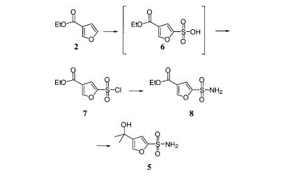 1-(1,2,3,5,6,7-Hexahydro-s-indacen-4-yl)-3-[4-(1-hydroxy-1-methylethyl)-furan-2-sulfonylurea 1 has been in development for treatment of inflammation. [1] The synthetic route to furan sulfonamide 5 used by its discoverer Mark Dombroski in Medicinal Chemistry is shown in Sch. 1. The starting material was ethyl 3-furoate 2. This was treated with excess methyl magnesium chloride to provide the 3-furanyl-tertiary alcohol 3. Furan alcohol 3 was deprotonated with methyl lithium followed by s-butyl lithium at low temperature and reacted with liquid sulfur dioxide to generate sulfinic acid 4. Without isolation, sulfinic acid 4 was oxidized to sulfonamide 5 with hydroxylamine O-sulfinic acid via a procedure described by workers at Merck.[2] We were interested in finding a synthesis of furan sulfonamide 5 and its conversion to sulfonylurea 1 that would be suitable for scale up. In this article, we describe the discovery of a better bulk process to sulfonamide 5 from the same starting material and a procedure to form the desired sulfonylurea without isolating the isocyanate of 4-amino-1,2,3,5,6,7-hexahydro-s-indacene.