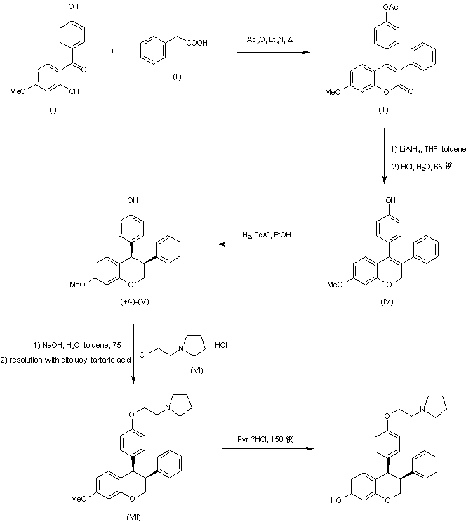 Coumarin (III) was prepared by condensation of benzophenone (I) with phenylacetic acid (II) in the presence of Ac2O and Et3N. Reduction of the lactone function of (III) with LiAlH4, followed by acidic treatment furnished diaryl chromene (IV). Subsequent hydrogenation of (IV) over Pd/C gave rise to the racemic cis chromane (V), which was O-alkylated with 1-(2-chloroethyl) pyrrolidine (VI) producing the corresponding (pyrrolidinyl)ethoxy derivative. Resolution by means of active ditoluoyl tartaric acid yielded the desired (-)-enantiomer (VII). Finally, cleavage of the methoxy group using pyridine hydrochloride at 150 C provided the title compound.