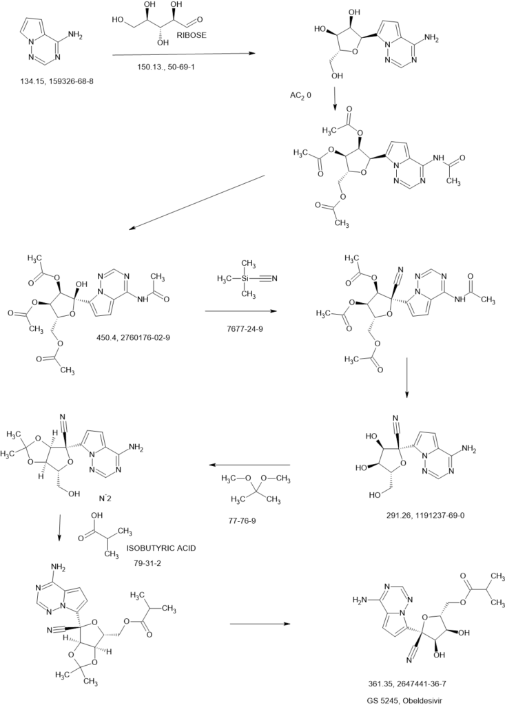 Obeldesivir (GS-5245, ATV006) is an isobutyric ester prodrug of GS-441524 made by Gilead Sciences that is currently in Phase III trials for the outpatient treatment of COVID-19 in high risk patients.[1][2] The purpose of the isobutyric ester modification on obeldesivir is to improve the oral bioavailability of the parent nucleoside, GS-441524. Obeldesivir is hydrolyzed to its parent nucleoside, GS-441524, which is in turn converted to remdesivir-triphosphate (GS-443902) by a nucleoside kinase, adenylate kinase and nucleotide diphosphate kinase.[3][4]