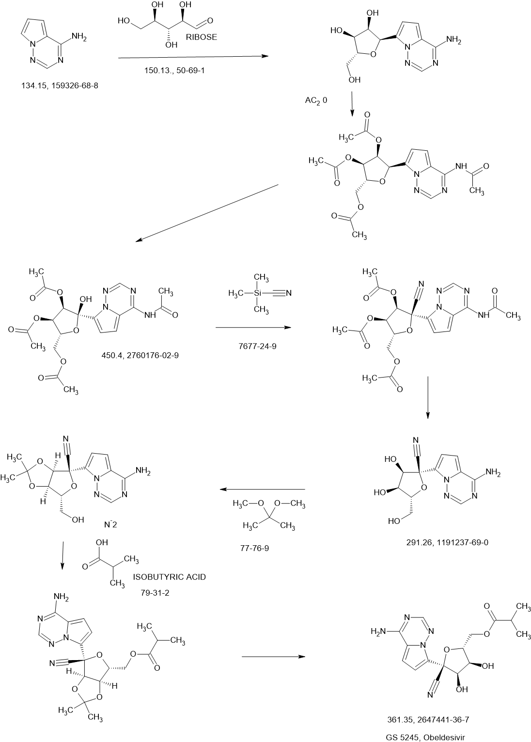 Obeldesivir (GS-5245, ATV006) is an isobutyric ester prodrug of GS-441524 made by Gilead Sciences that is currently in Phase III trials for the outpatient treatment of COVID-19 in high risk patients.[1][2] The purpose of the isobutyric ester modification on obeldesivir is to improve the oral bioavailability of the parent nucleoside, GS-441524. Obeldesivir is hydrolyzed to its parent nucleoside, GS-441524, which is in turn converted to remdesivir-triphosphate (GS-443902) by a nucleoside kinase, adenylate kinase and nucleotide diphosphate kinase.[3][4]