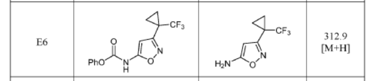 3-(1-(Trifluoromethyl)cyclopropyl)isoxazol-5-amine (precursor to E6) and 5-(1-(trifluoromethyl)cyclopropyl)isoxazol-3-amine (precursor to E7) were synthesized as reported in Synthesis 2013, 45, 171–173