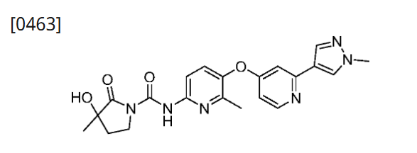 [0464]Palladium carbon (50 mg) was added to a solution of 3-(benzyloxy)-3-methyl-N-(6-methyl-5-((2-(1-methyl-1H-pyrazol-4-yl)pyridin-4-yl)oxy)pyridin-2-yl)-2-carbonylpyrrolidine-1-carboxamide (80 mg, 0.15 mmol) in methanol (10 mL). The reaction was stirred at 50° C. for 2 hours in the presence of hydrogen. Filtered and concentrated. Plate chromatography (dichloromethane/methanol=18:1) gave 3-hydroxy-3-methyl-N-(6-methyl-5-((2-(1-methyl-1H-pyrazol-4-yl)pyridin-4-yl)oxy)pyridin-2-yl)-2-carbonylpyrrolidine-1-carboxamide (10 mg, yield 15%). MS m/z(ESI):423[M+1]