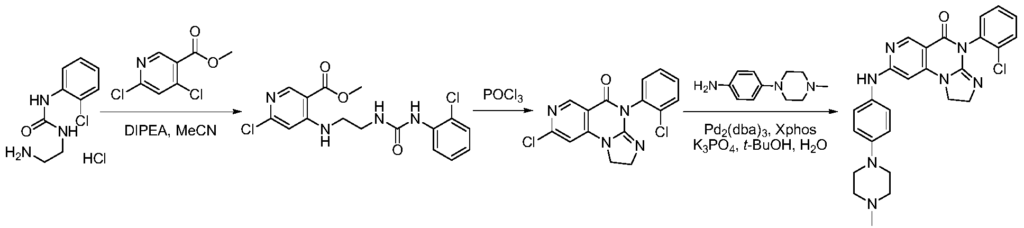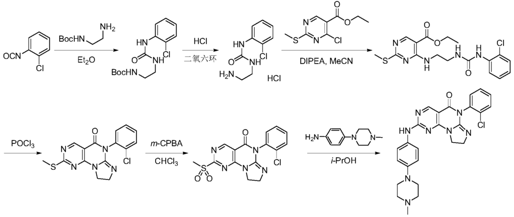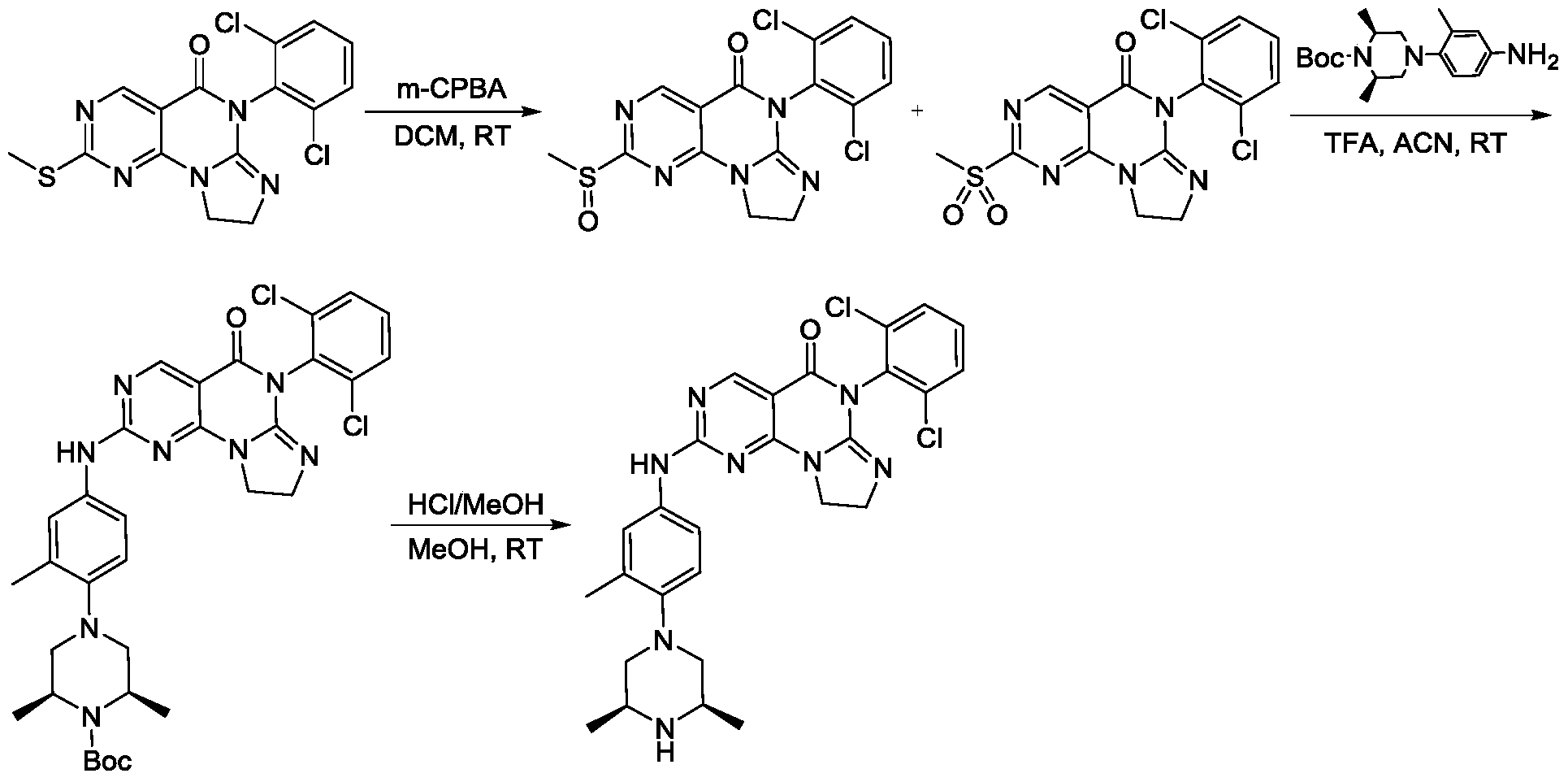 [0132]c) Preparation of 6-(2,6-dichlorophenyl)-2-((4-(((3S,5R)-3,5-dimethyl-4-(methyl-d3)piperazin-1-yl)-3-methylphenyl)amino)-8,9-dihydroimidazo[1,2-a]pyrimidino[5,4-e]pyrimidin-5(6H)-one: 4-((3S,5R)-3,5-dimethyl-4-(methyl-d3)piperazin-1-yl)-3-methylaniline (459.32 mg, 1.94 mmol) and the prepared 6-(2,6-dichlorophenyl)-2- A mixture (700 mg, crude) of crude (methanesulfonyl)-8,9-dihydroimidazo[1,2-a]pyrimido[5,4-e]pyrimidin-5(6H)-one and 6-(2,6-dichlorophenyl)-2-(methanesulfonyl)-8,9-dihydroimidazo[1,2-a]pyrimido[5,4-e]pyrimidin-5(6H)-one was dissolved in acetonitrile (5 mL) and trifluoroacetic acid (20.14 mg, 0.177 mmol, 13.08 μL) was added. The mixture was stirred at 20–25 °C for 2 hours, filtered, and the filtrate was concentrated under reduced pressure to give the crude product. The crude product was purified by reversed-phase HPLC to give the target compound (56.89 mg, 100.00 μmol, yellow solid, 5.66% yield). LC-MS (ESI): m/z (M+1) + 568.0.