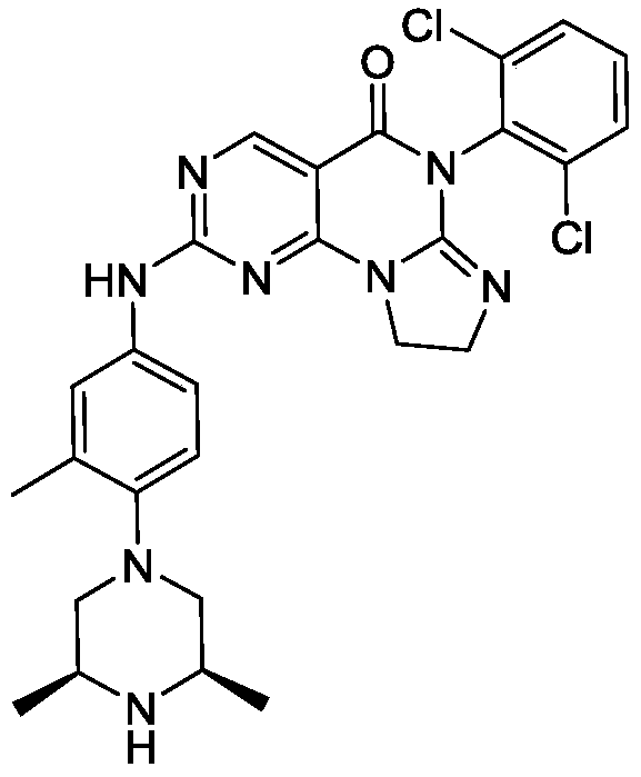 [0117]6-(2,6-dichlorophenyl)-2-((4-((3S,5R)-3,5-dimethylpiperazin-1-yl)-3-methylphenyl)amino)-8,9-dihydroimidazo[1,2-a]pyrimidino[5,4-e]pyrimidin-5(6H)-one