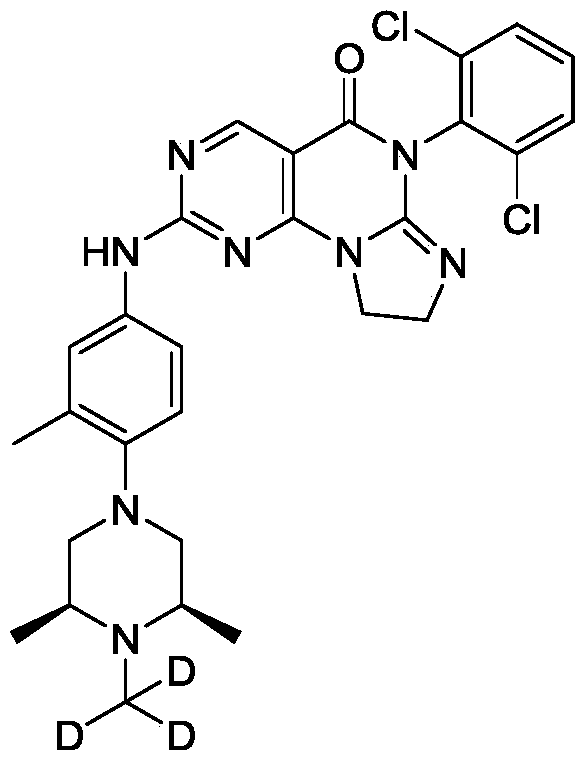 [0128]6-(2,6-dichlorophenyl)-2-((4-((3S,5R)-3,5-dimethyl-4-(methyl-d3)piperazin-1-yl)-3-methylphenyl)amino)-8,9-dihydroimidazo[1,2-a]pyrimidino[5,4-e]pyrimidin-5(6H)-one