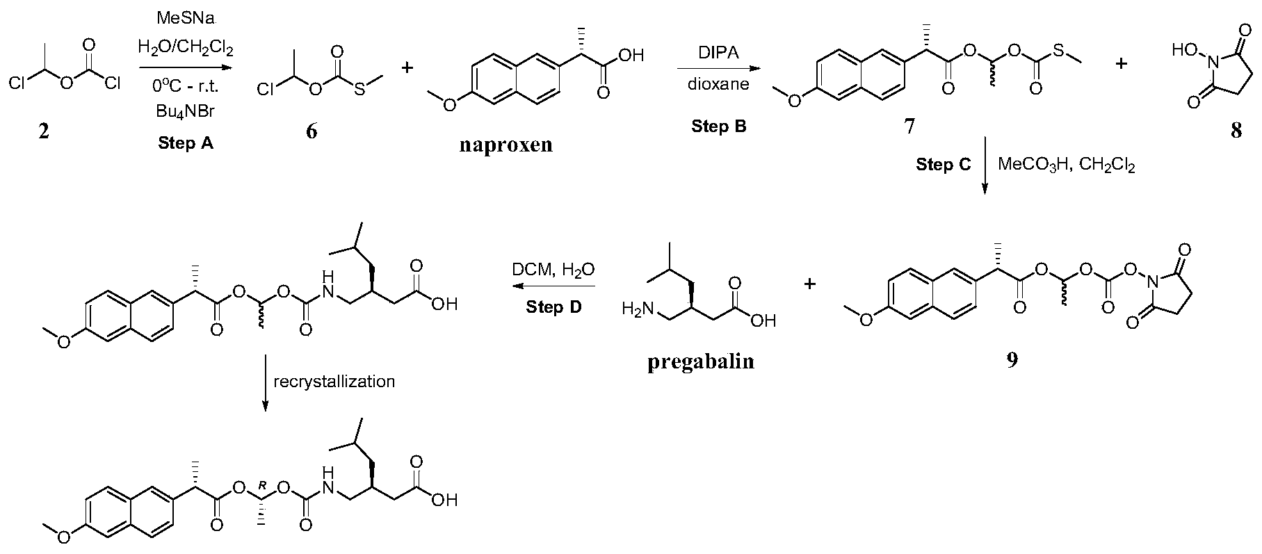 To a solution of the mixture of (S) – ( (R, S) -1- ( (2-fluorophenoxy) carbonyloxy) ethyl 2- (6-methoxynaphthalen-2-yl) propanoate (4) in acetonitrile and methyl tert-butyl ether in a suitable reaction vessel, purified water and pregabalin was charged. Triethylamine was added slowly while maintaining the temperature at about 15 ± 5℃. The temperature was raised to about 25 ± 3℃ for reaction. When the reaction was judged complete by the disappearance of (S) – ( (R, S) -1- ( (2-fluorophenoxy) carbonyloxy) ethyl 2- (6-methoxynaphthalen-2-yl) propanoate (criteria: ≤ 0.5%, by HPLC) the reaction was worked up. The resulting mixture was acidified with KHSO 4to pH 3~5 and extracted with methyl tert-butyl ether. The combined organic layers were washed with purified water and brine. The organic phase was then concentrated. Isopropanol was added and the solution was concentrated again. The isopropanol addition and the concentration cycle was repeated once or more times until the total residual acetonitrile and methyl tert-butyl ether was not more than 5% (by GC method) . n-Heptane was added into the mixture at about 40~45 ℃ and stirred and then the temperature was gradually lowered at set appropriate intervals to crystallize (S) -3- ( ( ( (R) -1- ( (S) -2- (6-methoxynaphthalen-2-yl) propanoyloxy) ethoxy) carbonyl-amino) methyl) -5-methylhexanoic acid (5) from the system. When the precipitation was complete, the heterogeneous mixture was centrifuged and the solid was collected.