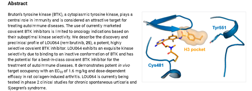 - Kaul M, End P, Cabanski M, Schuhler C, Jakab A, Kistowska M, Kinhikar A, Maiolica A, Sinn A, Fuhr R, Cenni B: Remibrutinib (LOU064): A selective potent oral BTK inhibitor with promising clinical safety and pharmacodynamics in a randomized phase I trial. Clin Transl Sci. 2021 Sep;14(5):1756-1768. doi: 10.1111/cts.13005. Epub 2021 Apr 9. [Article]