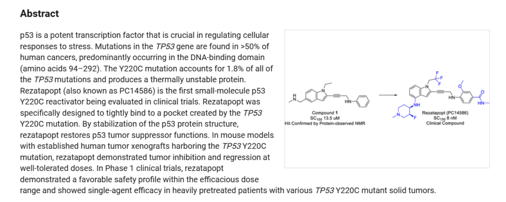 - [1]. Li Sujing, et al. Heteroarylalkyne compounds for targeting mutant of p53 and their preparation. World Intellectual Property Organization, WO2023016434 A1. 2023-02-16.[2]. Vu BT, et al. Discovery of Rezatapopt (PC14586), a First-in-Class, Small-Molecule Reactivator of p53 Y220C Mutant in Development. ACS Med Chem Lett. 2024 Nov 4;16(1):34-39. [Content Brief][3]. Spiegelberg D, et al. Targeting mutant p53: Evaluation of novel anti-p53R175H monoclonal antibodies as diagnostic tools. Sci Rep. 2025 Jan 6;15(1):1000. [Content Brief][4]. Schram A M, et al. 691TiP PYNNACLE phase II trial of rezatapopt (PC14586) in solid tumors with a TP53 Y220C mutation[J]. Annals of oncology, 2024, 35: S535-S536.