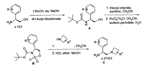 Example 4 was prepared following the general synthesis of A-E starting with (S)-2- amino-2-(3,4-di-fluoro-phenyl)-ethanol.LCMS [384.20 (M+1)]. 1H NMR (DMSO-d6, ppm) 1.92 (2H), 2.75 (1H), 2.93 (1H), 3.15 (4H), 5.43 (1H), 7.34 (2H), 7.53 (1H), 7.68 (1H), 7.81 (1H), 8.58 (4H), 10.30 (1H).