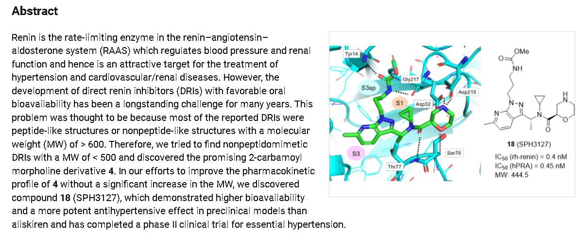 - Iijima, Daisuke; Sugama, Hiroshi; Takahashi, Yoichi; Hirai, Miki; Togashi, Yuko; Xie, Jianshu; Shen, Jingkang; Ke, Ying; Akatsuka, Hidenori; Kawaguchi, Takayuki; Takedomi, Kei; Kashima, Akiko; Nishio, Masashi; Inui, Yosuke; Yoneda, Hikaru; Xia, Guangxin; Iijima, Toru (25 August 2022). “Discovery of SPH3127: A Novel, Highly Potent, and Orally Active Direct Renin Inhibitor”. Journal of Medicinal Chemistry. 65 (16): 10882–10897. doi:10.1021/acs.jmedchem.2c00834. PMID 35939295. S2CID 251400126.