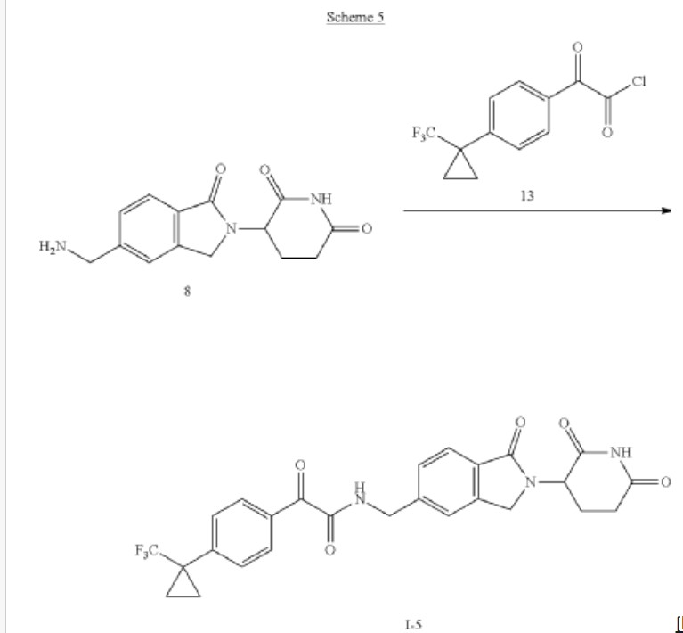 To a solution of 3-(5-(aminomethyl)-1-oxoisoindolin-2-yl)piperidine-2,6-dione 8 (80 mg, 0.258 mmol) in DCM (4 mL) at 0° C. was added TEA (52.2 mg, 0.516 mmol). After stirring for 2 min, 2-oxo-2-(4-(1-(trifluoromethyl)cyclopropyl)phenyl)acetyl chloride 13 (71.3 mg, 0.258 mmol) was added and the mixture was stirred at RT for 2 h. After concentration, the residue was purified using prep-HPLC eluting with ACN/H 2O (0.1% TFA) from 10% to 95% to afford compound I-5 (16.1 mg) in 12% yield. MS (ESI) m/z: 514.0 [M+H] +; 1H NMR (400 MHz, DMSO-d 6) δ 10.98 (s, 1H), 9.57 (t, J=6.0 Hz, 1H), 8.03-8.01 (m, 2H), 7.74-7.48 (m, 7H), 5.13-5.09 (m, 1H), 4.59-4.57 (m, 2H), 4.49-4.31 (m, 2H), 2.95-2.87 (m, 1H), 2.63-2.58 (m, 1H), 2.45-2.38 (m, 1H), 2.03-1.99 (m, 1H), 1.43-1.40 (m, 2H), 1.24-1.21 (m, 2H).