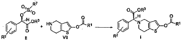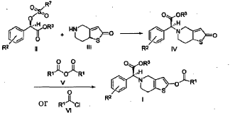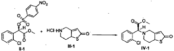 [0036] 58.1 g (0.15 mol) of (R)-methyl 2-(2-chlorophenyl)-2-(4-nitrophenylsulfonyloxy)-acetate ( II-1), 32.3 g (0.17 mol) of 5,6,7,7a-tetrahydrothieno[3,2-c]pyridin-2(4H)-one hydrochloride ( III-1), and 37.8g (0.38 mol) of potassium bicarbonate were added to 500 ml of acetonitrile. The reaction was stirred under a nitrogen atmosphere at room temperature for 26 hrs. The reaction solution was allowed to stand and the insoluble material was filtered off, to obtain a dark red mother liquor. The solvent was evaporated under reduced pressure, and 35.4 g of an oil product was obtained after purification by flash column chromatography (petroleum ether:ethyl acetate = 4:1). Yield 70%. Recrystalization from ethanol afforded 18.1 g of a pure product (IV-1) as a white solid. mp: 146-148°C, ee = 97.5%, [α] D 19 = +114.0° (c 0.5, MeOH); 1H-NMR (300 MHz, CDCl 3) δ 1.79-1.93 (m, 1 H), 2.30-2.40 (m, 1 H), 2.56-2.70 (m, 1 H), 3.00-3.27 (m, 2 H), 3.72 (s, 3 H), 3.79-3.93 (m, 1 H), 4.12-4.19 (m, 1 H), 4.89 (d, 1 H, J= 5.6 Hz), 6.00 (d, 1 H, J = 5.2 Hz), 7.26-7.50 (m, 4 H); 13C-NMR (75 MHz, CDCl 3) δ 33.9, 34.0, 49.0, 49.7, 51.1, 51.6, 52.2, 52.4, 67.3, 76.6, 77.0, 77.4, 126.6, 126.8, 127.2, 129.8, 130.1, 132.7, 134.8, 167.2, 167.4, 170.8, 198.6; ESI-MS m/ z 338.1 [M+H] +; HRMS Calcd for C 16H 17NO 3SCl [M+H] + m/ z 338.0618, found 338.0626.