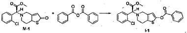 [0038] (2S)-Methyl 2-(2-chlorophenyl)-2-(2-oxo-5,6,7,7a-tetrahydrothieno[3,2-c]pyridinyl)acetate ( IV– 1) (113 mg) was dissolved in acetonitrile (10 ml), 0.10 ml of triethylamine was added, and 151 mg of benzoic anhydride was added dropwise at 0°C, and then the mixture was warmed to room temperature and reacted for 2 hrs. The reaction solution was poured into water (30 ml), the aqueous phase was extracted with ethyl acetate (50 ml x 3), and the organic phase was washed with saturated aqueous sodium bicarbonate solution and saturated saline, dried over anhydrous sodium sulfate, and evaporated, to obtain a crude product, which was subjected to flash column chromatography (petroleum ether:ethyl acetate = 40 : 3), to obtain (S)-methyl 2-(2-benzoyloxy-6,7-dihydrothieno[3,2-c]pyridin-5(4H)-yl)-2-(2-chlorophenyl)-acetate (I-1) (77 mg). Yield 52%, mp: 84-86°C, ee = 93.5% (chiral HPLC analysis conditions: Chiralpak IC 4.6 mm x 250 mm; column temperature: 25° C; mobile phase: 90% n-hexane/10% isopropanol/0.1% diethylamine; flow rate: 0.5 ml/min; and detection wavelength: UV 254 nm), [α] D20 = +34.00° (c 0.50, MeOH); 1H-NMR (300 MHz, CDCl 3) δ 2.82-2.93 (m, 4 H), 3.57-3.68 (m, 2 H), 3.73 (s, 3 H), 4.95 (s, 1 H), 6.42 (s, 1 H), 7.26-8.17 (m, 9 H); 13C-NMR (75 MHz CDCl 3) δ 25.0, 48.2, 50.4, 52.2, 67.8, 112.1, 125.9, 127.2, 128.5, 128.6, 129.5, 129.8, 130.0, 130.2, 133.9, 134,7, 149.9, 163.5; ESI-MS m/ z 442.1 [M+H] +; HRMS Calcd for C 23H 21NO 4SCl [M+H] +m/ z 442.0891, found 442.0880.