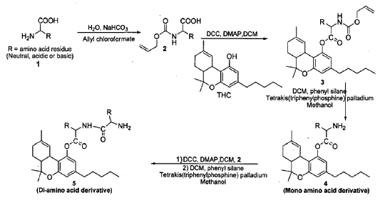 Spectral analysis of Δ9-THC prodrugs prepared above: Identity and purity of the synthesized prodrugs was established by spectral means including 1H-NMR, 13C-NMR and 2D-NMR such as COSY, HMQC, HMBC, as well as other spectroscopic means (IR1 UV and MS). The synthetic protocols outlined above yielded prodrugs with ≥95% purity.