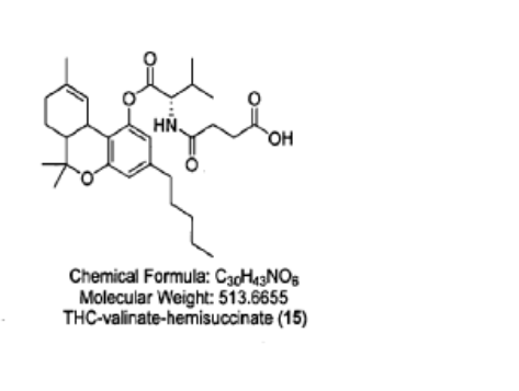 Compound 15 was also prepared using scheme II, where the starting material was compound 6 (THC-valinate). Product 15 was purified using column chromatography (>85% yield) and confirmed by mass spectroscopy in the positive ionization mode (M+NlV = 531) (Fig 17). The structure of product 15 was also confirmed by spectral analysis 1H-NMR and 13C-NMR (see Fig 18 for 13C-NMR assignments).