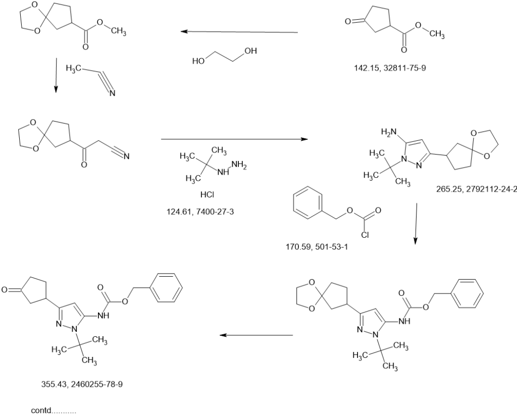 A solution of the crude (±)-benzyl [1-tert-butyl-3-(3,3-dimethoxycyclopentyl)-1H-pyrazol-5-yl]carbamate (1 d, 980 g, 1.98 mol max) in acetone (2 L) and water (2 L) at 18 °C was treated with 4-toluenesulfonic acid monohydrate (48.75 g, 256.3 mmol). The mixture was heated to 60 °C internal for 20 hours. After concentration under vacuum to remove most of the acetone, the aqueous residue was extracted with dichloromethane (3 x 3 L). The combined organic extracts were dried over sodium sulfate, filtered, and concentrated under vacuum to a crude red oil. This crude product was combined with crude from two other identically-prepared batches (each derived from 1.98 mol 1c, 5.94 mol total for the 3 batches), and purified by silica gel chromatography (eluting with 0- 50% ethyl acetate in petroleum ether) to give (±)-benzyl [1-tert-butyl-3-(3-oxocyclopentyl)-1H-pyrazol-5-yl]carbamate (1 e, 1.6 kg) as a yellow solid. This solid was stirred in 10:1 petroleum ether/ethyl acetate (1.5 L) at 20 °C for 18 hours. The resulting suspension was filtered, the filter cake washed with petroleum ether ( 2 x 500 mL), and the solids dried under vacuum to give (±)-benzyl [1-tert-butyl-3-(3-oxocyclopentyl)-1H-pyrazol-5-yl]carbamate (1 e, 1.4 kg, 3.9 mol, 66% combined for the three batches). 1H NMR (DMSO–d6) δ = 9.12 (br. s., 1H), 7.56-7.13 (m, 5H), 6.03 (s, 1 H), 5.12 (s, 2H), 3.41-3.27 (m, 1H), 2.48-2.39 (m, 1H), 2.34-2.10 (m, 4H), 1.98-1.81 (m, 1 H), 1.48 (s, 9H).