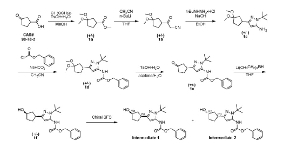 Preparation of Intermediate 1: benzyl {1-tert-butyl-3-[(1S,3R)-3-hvdroxycvclopentyl]1H-pyrazol-5-yl)carbamate; and Intermediate 2: benzyl {1-tert-butyl-3-[(1R,3S)-3-hydroxycvclopentyl1-1H-pyrazol-5-yl)carbamate.