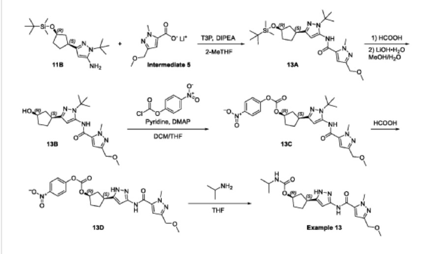 A solution of N-{1-tert-butyl-3-[(1S,3R)-3-hydroxycyclopentyl]-1H-pyrazol-5-yl}-3-(methoxymethyl)-1-methyl-1H-pyrazole-5-carboxamide (13B, 8.0 g, 21 mmol) in dichloromethane (80 mL) and THF (80 mL) was treated with DMAP (260 mg, 2.13 mmol), pyridine (5.06 g, 63.9 mmol), and 4-nitrophenyl chloroformate (8.59 g, 42.6 mmol). The resulting yellow suspension was stirred at room temperature for 18 hours. The reaction mixture was concentrated to dryness and purified by silica gel chromatography (eluting with 0-45% ethyl acetate in petroleum ether) to give (1R,3S)-3-[1-tert-butyl-5-({[3-(methoxymethyl)-1-methyl-1H-pyrazol-5-yl]carbonyl}amino)-1H-pyrazol-3-yl]cyclopentyl 4-nitrophenyl carbonate (13C, 10.6 g, 92%) as a light brown gum. MS: 541 [M+H]+.