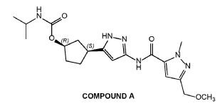 hydroxide v/v) in acetonitrile. After lyophilization, (1R,3S)-3-[3-({[3-(methoxymethyl)-1-methyl-1H-pyrazol-5-yl]carbonyl}amino)-1H-pyrazol-5-yl]cyclopentyl propan-2 -ylcarbamate (COMPOUND A, 2.06 g, 78%) was obtained as a white crystalline solid monohydrate. MS: 405 [M+H]+. 1H NMR (400MHz, DMSO-d6) d = 12.23 (br s, 1H), 10.73 (br s, 1H), 7.11 (s, 1H), 6.96 (br d, J=7.0 Hz, 1H), 6.41 (br s, 1H), 5.00 (br s, 1H), 4.33 (s, 2H), 4.04 (s, 3H), 3.57 (qd, J=6.6, 13.4 Hz, 1H), 3.26 (s, 3H), 3.17-2.96 (m, 1H), 2.48-2.39 (m, 1H), 2.03 (br d, J=6.8 Hz, 1H), 1.95-1.83 (m, 1H), 1.73 (br d, J=8.5 Hz, 2H), 1.61 (br s, 1 H), 1.03 (br d, J=6.3 Hz, 6H). Optical rotation [α]D +4.8 (c 1.0, MeOH). Chiral purity: >99% ee by chiral analytical SFC. Anal. Calcd for C19H28N6O4-H2O: C, 54.02; H, 7.16; N, 19.89. Found: C, 53.94; H, 7.22; N, 19.81.