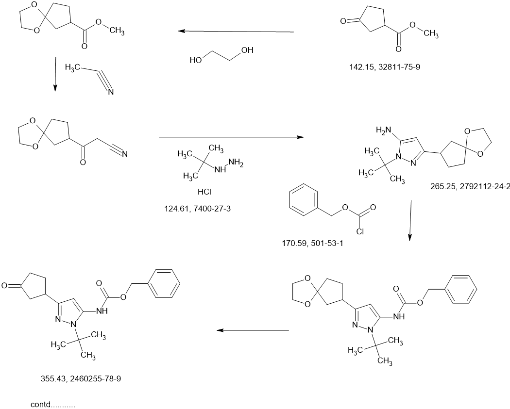 A solution of the crude (±)-benzyl [1-tert-butyl-3-(3,3-dimethoxycyclopentyl)-1H-pyrazol-5-yl]carbamate (1 d, 980 g, 1.98 mol max) in acetone (2 L) and water (2 L) at 18 °C was treated with 4-toluenesulfonic acid monohydrate (48.75 g, 256.3 mmol). The mixture was heated to 60 °C internal for 20 hours. After concentration under vacuum to remove most of the acetone, the aqueous residue was extracted with dichloromethane (3 x 3 L). The combined organic extracts were dried over sodium sulfate, filtered, and concentrated under vacuum to a crude red oil. This crude product was combined with crude from two other identically-prepared batches (each derived from 1.98 mol 1c, 5.94 mol total for the 3 batches), and purified by silica gel chromatography (eluting with 0- 50% ethyl acetate in petroleum ether) to give (±)-benzyl [1-tert-butyl-3-(3-oxocyclopentyl)-1H-pyrazol-5-yl]carbamate (1 e, 1.6 kg) as a yellow solid. This solid was stirred in 10:1 petroleum ether/ethyl acetate (1.5 L) at 20 °C for 18 hours. The resulting suspension was filtered, the filter cake washed with petroleum ether ( 2 x 500 mL), and the solids dried under vacuum to give (±)-benzyl [1-tert-butyl-3-(3-oxocyclopentyl)-1H-pyrazol-5-yl]carbamate (1 e, 1.4 kg, 3.9 mol, 66% combined for the three batches). 1H NMR (DMSO–d6) δ = 9.12 (br. s., 1H), 7.56-7.13 (m, 5H), 6.03 (s, 1 H), 5.12 (s, 2H), 3.41-3.27 (m, 1H), 2.48-2.39 (m, 1H), 2.34-2.10 (m, 4H), 1.98-1.81 (m, 1 H), 1.48 (s, 9H).