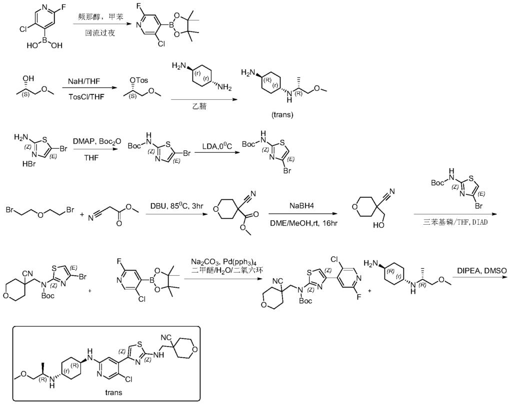 1 -((R)-1-methoxypropyl-2-yl)cyclohexane-1,4-diamine (3.9 g, 21.2 mmol) and diisopropylethylamine (DIPEA) were added to 30 mL of dimethyl sulfoxide. Under nitrogen protection, the mixture was heated to 100-110 °C and reacted for two days. The reaction was monitored by TLC and LCMS. The starting material (4-(5-chloro-2-fluoropyridin-4-yl)thiazolyl)((4-cyano-tetrahydro-2H-pyran-4-yl)methyl)carbamate tert-butyl ester had completely disappeared, with some BOC-free intermediate remaining. The reaction was stopped, and the reaction solution was cooled and diluted with ethyl acetate (60 mL). Water (150 mL) was added under ice bath. The mixture was separated, and the aqueous layer was extracted again with ethyl acetate (2 × 50 mL). The organic layers were combined, washed with saturated brine (100 mL), dried with anhydrous sodium sulfate, filtered, and concentrated to obtain a crude product of yellowish-brown oil. Column separation (acetonitrile/water/trifluoroacetic acid = 80/20/0.001) yielded 700 mg of 4-(((4-(5-chloro-2-(((1R,4r)-4-(((R)-1-methoxypropyl-2-yl)amino)cyclohexyl)amino)pyridin-4-yl)thiazolyl)amino)methyl)tetrahydro-2H-pyran-4-carboxynitrile, a pale yellow solid. Yield: 19.1%. ¹H NMR (400 MHz, CDCl₃