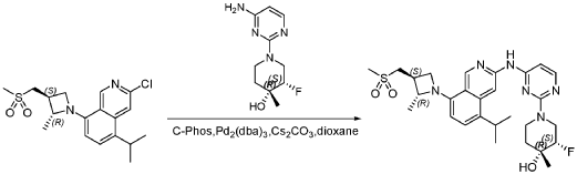 To a solution of 3-chloro-8-[(2R,3S)-3-(methanesulfonylmethyl)-2-methylazetidin-l-yl]-5-(propan-2-yl)isoquinoline(28 g,76.3mmol, from step 1 of Example 3), (3R,4S)-l-(4-aminopyrimidin-2-yl)-3-fluoro-4-methylpiperidin-4-ol(17.2g,76.3mmol, peak 1 from Example B12), CS2CO3 (49.8 g, 152 mmol),C-phos (4.27 g, 9.15mmol, 2-dicyclohexylphosphino-2’,6’-bis(N,N-dimethylamino)biphenyl) and Pd2(dba)3 (3.94 g, 3.81 mmol) in dioxane (400 mL) was heated to 100 °C for 16 h under N2 atmosphere. The mixture reaction was filtered and the filtrate was concentration under vacuum. The residue was applied onto a silica gel column with EA/PE (2: 1) to give product 28.8 g (67%) as a light-yellow solid.