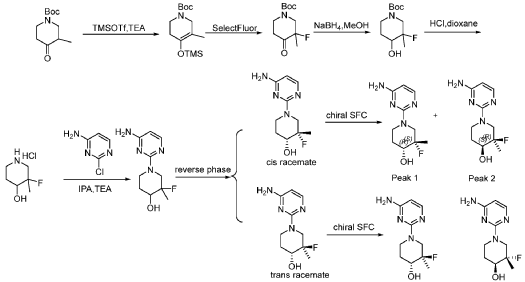 Example 5, Compound 117: Synthesis of (3S,4R)-3-fluoro-l-(4-(5-isopropyl-8-((2R,3S)-2-methyl-3-(methylsulfonylmethyl)azetidin-l-yl)isoquinolin-3-ylamino)pyrimidin-2-yl)-4-methylpiperidin-4-ol