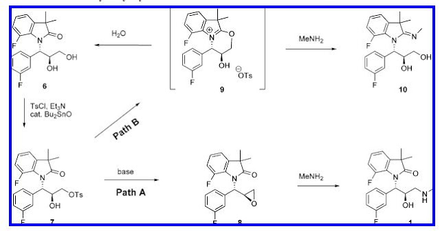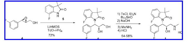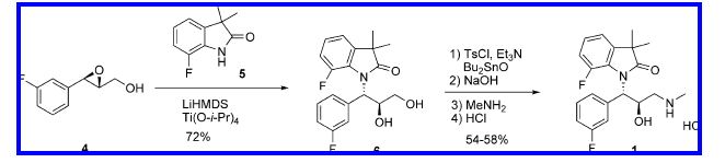 Sharpless epoxidation of fluorocinnamic alcohol 3 which selectively introduced both relative and absolute configurations at the C-2 and C-3 positions. At the early stages of the project, allylic alcohol 3 was prepared in two steps from commercially available fluorocinnamic acid 2 by treatment with MeI in the presence of Cs2CO3 in acetone, followed by DIBAL reduction at -78 °C. The epoxide 4 was opened with the sodium salt of dimethylfluoroindolinone in DMF to afford the diol. The diol 6 was further elaborated into the final aminoalcohol hydrochloride 1 in 30-34% yield via tosylation with p-toluenesulfonyl chloride (TsCl) in pyridine, isolation of the intermediate monotosylate, treatment with MeNH2, and conversion to HCl salt. Dimethylfluoroindolinone was prepared by reduction and bis-methylation of 7-fluoroisatin by a process developed earlier as described in a prior publication.3